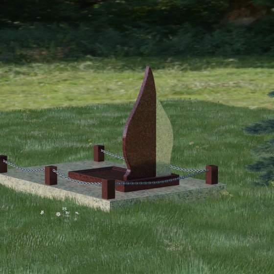 Конструкция модели 018 продумана до мелочей, включая полное благоустройство места захоронения. Монумент устанавливается на массивный двухцветный постамент, который обеспечивает устойчивость всей вертикальной конструкции. Особое внимание уделено обустройству прилегающей территории: вместо открытого грунта используется сплошное мощение плитами из натурального гранита. Это не только придает мемориальному комплексу законченный и достойный вид, но и значительно упрощает уход за ним, исключая появление сорняков и скопление грязи. Периметр участка обозначен строгим и лаконичным ограждением в виде невысоких каменных столбиков-боллардов, соединенных декоративными металлическими цепями. Такая ограда создает приватную зону, не загромождая пространство, и подчеркивает элитарность комплекса.