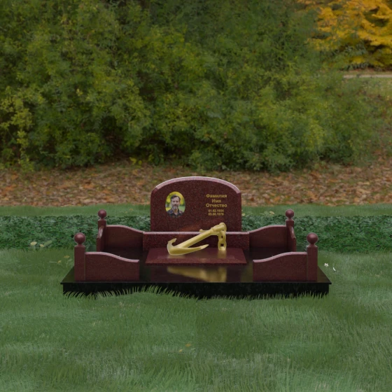 • Центральный символ: На надгробной плите расположен объемный декоративный элемент в виде золотого якоря с массивной цепью. Этот символ олицетворяет надежду, твердость характера и профессиональный путь, связанный со стихией, становясь смысловым центром всего мемориала.