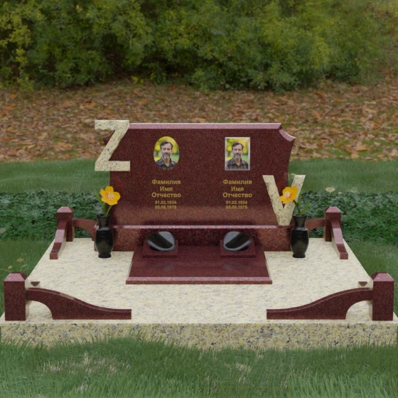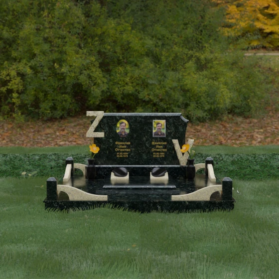 Центральным элементом изделия является массивная горизонтальная стела, обладающая сложной многоуровневой геометрией. Верхняя грань плиты украшена изящными симметричными вырезами, которые смягчают строгость прямоугольных форм и придают конструкции завершенный, эстетически выверенный вид. Особое внимание привлекает игра контрастов: глубокая зеркальная полировка основного массива камня эффектно подчеркивается светлыми вставками. Рельефные буквы Z и V, выполненные из контрастного гранита, выступают над поверхностью, создавая впечатляющий эффект объема и наделяя монумент уникальным характером.