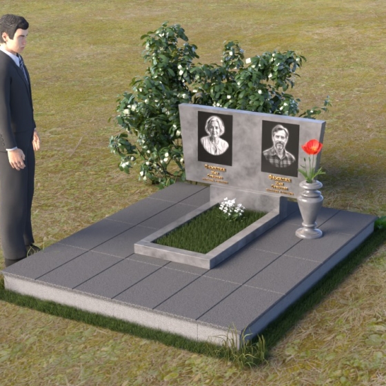 Этот памятник представляет собой изысканную композицию, где строгость линий сочетается с плавными, утонченными деталями. Стела имеет прямоугольную форму с асимметричной верхней гранью. С левой стороны верхний угол плавно скошен вниз, создавая ощущение ниспадающей драпировки или крыла ангела, оберегающего покой усопших. Правый верхний угол стелы остается прямым, что придает конструкции визуальную устойчивость и завершенность. Боковые грани стелы тщательно отполированы, что создает эффект зеркального блеска, отражающего окружающий мир и символизирующего связь между земным и небесным. Под стелой располагается горизонтальная плита меньшего размера, также выполненная в зеркальной полировке, создавая эффект единого целого и усиливая визуальную глубину композиции. Все элементы памятника установлены на широкое основание, облицованное плиткой серого цвета, что обеспечивает устойчивость и долговечность конструкции.