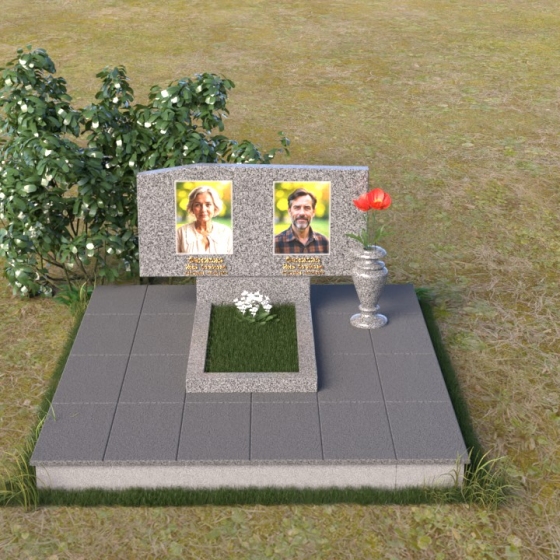 Основным элементом композиции является вертикальная плита, возвышающаяся над прямоугольным основанием. Гранитная плита имеет слегка вогнутую форму верхней грани, что придает ей мягкость и визуально облегчает массивность. На отполированной до зеркального блеска поверхности выгравированы портреты усопших, выполненные с высокой степенью детализации. Под портретами располагаются надписи с именами и датами жизни, выполненные строгим шрифтом. Вся композиция пронизана чувством сдержанности и достоинства, что позволяет сосредоточиться на главном – на памяти о тех, кого больше нет рядом.