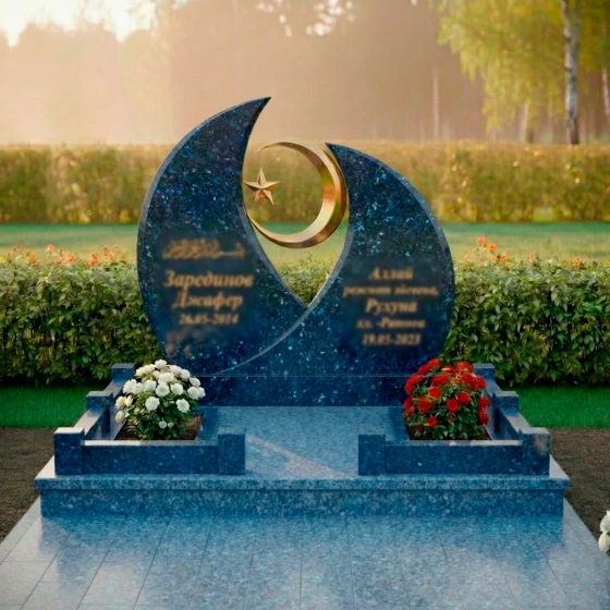 Модель ПН 157 представляет собой истинное произведение искусства, воплощенное в камне, призванное стать вечным символом памяти и уважения. Величественная стела, выполненная в глубоком черном цвете, мгновенно притягивает взгляд своей необычной, но гармоничной формой. Ее силуэт напоминает два полумесяца, обращенных друг к другу, создавая динамичную композицию, которая символизирует единство и бесконечность. В центре этой дуальности, словно небесное светило, парит золотистый полумесяц, в объятиях которого покоится изящная пятиконечная звезда. Этот центральный элемент выполнен с ювелирной точностью, его отполированная до зеркального блеска поверхность отражает свет, создавая ощущение невесомости и духовности. Грани стелы тщательно обработаны, демонстрируя безупречную гладкость и плавные переходы, которые подчеркивают естественную красоту камня. Зеркальная полировка черного гранита создает эффект глубокого космоса, в котором каждый луч света играет и преломляется, обещая сохранить свой первозданный блеск на столетия, неподвластный времени и стихиям.