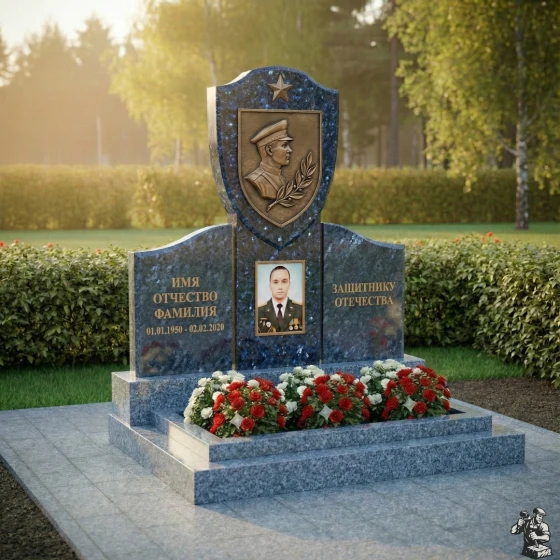 Центральное место в композиции занимает верхняя часть стелы, выполненная в форме геральдического щита, увенчанного пятиконечной звездой — символом воинской доблести и славы. На щите расположен объемный бронзовый барельеф, изображающий профиль мужчины в военной форме, окруженный лавровой ветвью — традиционным знаком победы и мира. Этот элемент придает монументу особую торжественность и подчеркивает героический характер личности. Под щитом, на основной части стелы, расположена глубокая ниша, предназначенная для портрета, который словно вписан в камень, становясь его неотъемлемой частью. Текст «ИМЯ ОТЧЕСТВО ФАМИЛИЯ» и даты жизни выполнены четким, строгим шрифтом, а справа расположена надпись «ЗАЩИТНИКУ ОТЕЧЕСТВА», выгравированная с особым почтением. Контраст между идеально отполированной черной поверхностью камня и матовыми, глубоко выгравированными элементами создает динамичное визуальное восприятие, подчеркивая значимость каждой детали.