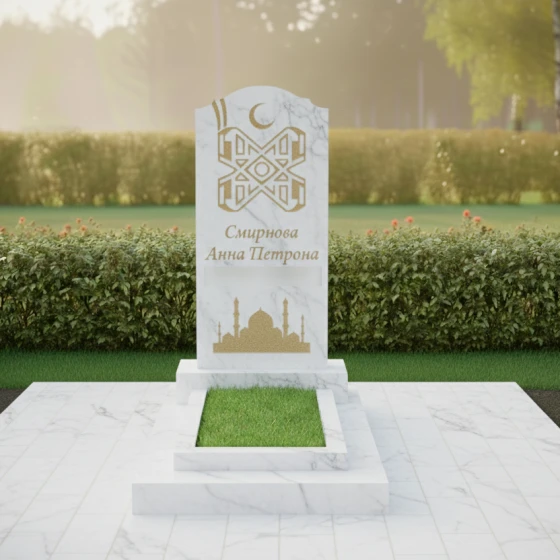 Особое внимание привлекает филигранная гравировка, расположенная в верхней части стелы. Символ полумесяца и сложный геометрический орнамент, выполненные с ювелирной точностью, подчеркивают конфессиональную принадлежность и глубокую связь с верой. В нижней части полотна расположено контурное изображение мечети с высокими минаретами — это не просто декор, а символ духовного пристанища и покоя. Сочетание глянцевой поверхности основного камня и матового, светлого напыления внутри резных элементов создает благородный контраст, делая изображение объемным и читаемым при любом освещении.