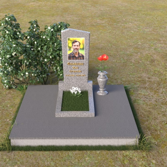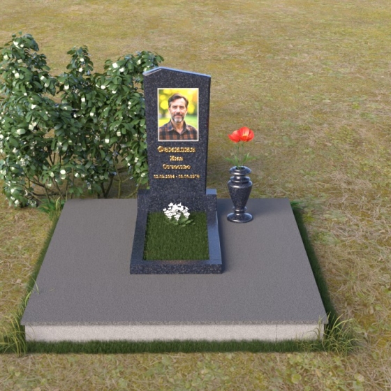 Этот гранитный монумент представляет собой композицию из двух основных элементов: вертикальной плиты с портретом и горизонтальной накладки. Вертикальная плита, возвышающаяся над землей, имеет строгую прямоугольную форму с небольшим скосом в верхней части. Это придает монументу сдержанную элегантность. Зеркальная полировка поверхности отражает свет, создавая ощущение глубины и сияния. На плите выгравирован портрет усопшего, выполненный с высокой точностью и вниманием к деталям. Ниже портрета располагается надпись с именем и датами жизни, выполненная золотым шрифтом. Горизонтальная накладка, расположенная в нижней части, также выполнена из черного полированного гранита и служит своеобразным пьедесталом для вертикальной плиты. Ее гладкая поверхность создает дополнительный контраст с окружающей средой. Рядом с монументом установлена ваза из черного гранита, предназначенная для живых цветов.