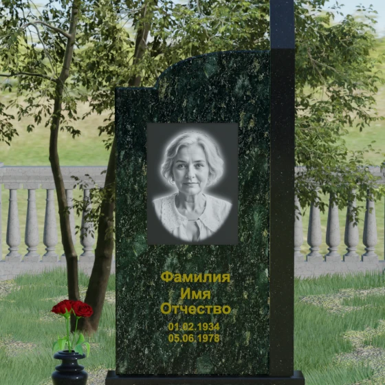 Широкое полотно основной стелы открывает безграничные возможности для художественного оформления. Форма идеально подходит для размещения крупного портрета в технике гравировки с мягкой растушевкой («ореолом»), что создает эффект живого взгляда. Золоченая кириллица имен и дат особенно выразительно смотрится на темном фоне, придавая мемориалу статусность и торжественность. Для того чтобы отразить индивидуальность и характер ушедшего человека, данная модель доступна в 8 цветовых решениях. Вы можете выбрать классический черный гранит Габбро-диабаз, благородный серо-белый Мансуровский гранит, насыщенный красный Лезниковский или глубокий коричневый Дымовский. Также доступны экзотические варианты: лесной Балтик грин, искрящийся Блю Перл, контрастный амфиболит или сияющий белизной мрамор Тассо. Комбинирование двух видов камня позволяет создать уникальный контраст фактур и оттенков, подчеркивая архитектурную сложность изделия.