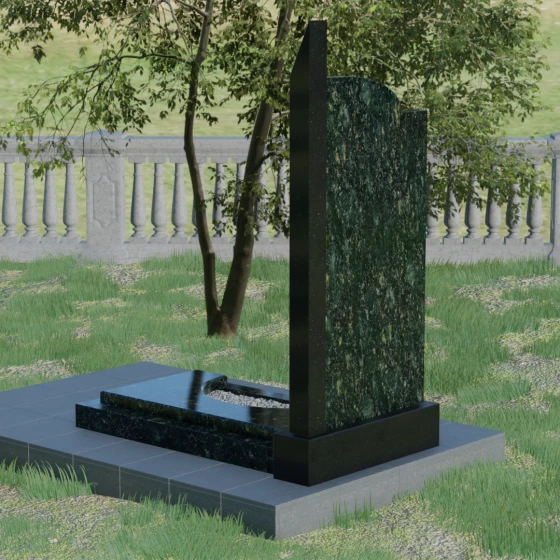 Данная мемориальная композиция представляет собой образец современного архитектурного искусства, где строгая геометрия встречается с мягкой природной грацией. Дизайн изделия построен на эстетике асимметрии: левый край стелы выполнен в виде четкого, волевого «шага», который мгновенно переходит в плавную, нисходящую дугу с правой стороны. Такая форма символизирует баланс между земной твердостью и бесконечным небесным покоем. Вертикальная стела дополнена узким акцентным столпом из контрастного камня, который создает мощную вертикаль, визуально устремляя всю конструкцию ввысь. Тщательно выверенные пропорции позволяют этому монументу органично вписаться в ландшафт любого мемориального комплекса, выделяясь своей лаконичностью и благородством линий.