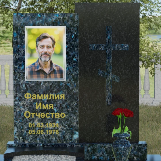 Данная модель представляет собой сложную двухкомпонентную конструкцию, построенную на гармонии противоположностей. Основной вертикальный элемент разделен на две части разного цвета и фактуры. Левая панель, выполненная из темного, глубокого камня, предназначена для центрального акцента — портрета и мемориальных надписей. Благодаря идеальной гладкости, гравировка здесь выглядит максимально четко, а портрет обретает фотографическую точность и одухотворенность. Правая часть композиции — это блок из светлого камня, на котором располагается лаконичный православный крест. Крест выполнен в строгом черном цвете, что создает мощный визуальный контраст на светлом фоне, подчеркивая духовную чистоту и значимость символа веры. Геометрия модели подчеркнуто строгая: прямые линии и четкие грани символизируют твердость характера и прямоту жизненного пути.