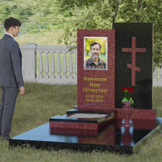 Благоустройство участка в данной модели выполнено по европейскому стандарту. Весь ансамбль установлен на массивный гранитный цоколь, который служит надежным фундаментом и защищает конструкцию от перекосов почвы. Вместо традиционного открытого цветника здесь используется закрытая надгробная плита оригинальной формы. Её верхний элемент выполнен в виде изящной светлой арки, которая эффектно возвышается над темным основанием, создавая многоуровневость. Такое решение не только придает мемориалу законченный, аккуратный вид, но и значительно упрощает уход за местом захоронения. Завершает композицию изящная каменная ваза, интегрированная в общую стилистику, что позволяет всегда поддерживать эстетику участка, украшая его цветами в знак вечной любви.