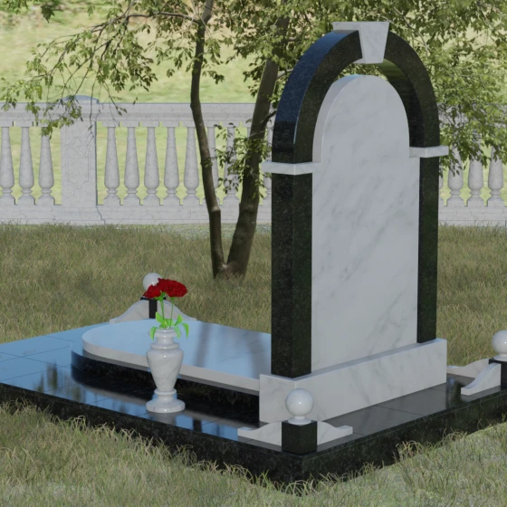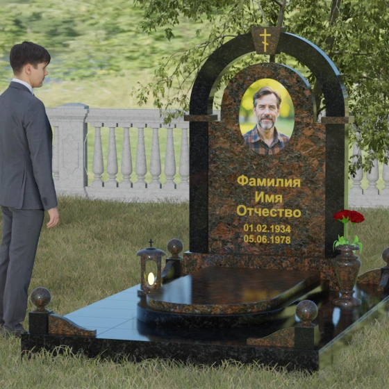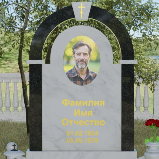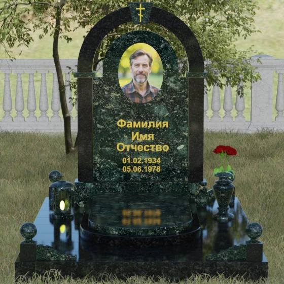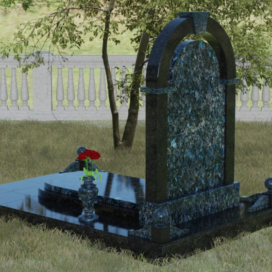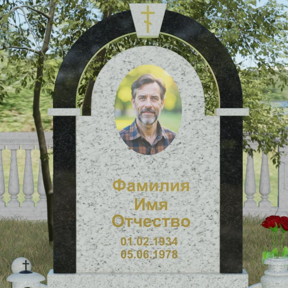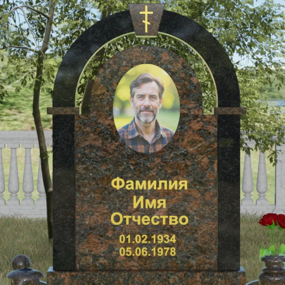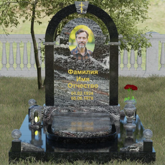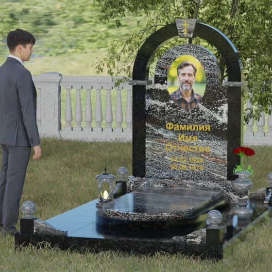 Представленная мемориальная композиция — это триумф архитектурной мысли, воплощенный в благородном камне. В основе дизайна лежит классическая форма арки, которая во многих культурах символизирует небесный свод и торжественный переход в вечность. Центральная стела, имеющая мягкое скругление сверху, обрамлена массивным внешним контуром, создающим эффект глубины и защищенности. Такое многоуровневое решение позволяет играть на визуальных объемах: строгие вертикальные линии боковых колонн уравновешиваются плавным изгибом верхней части, подчеркивая гармонию и покой. Зеркальная полировка лицевых граней доведена до совершенства, в ней отражается мир, напоминая о хрупкой связи между прошлым и настоящим.