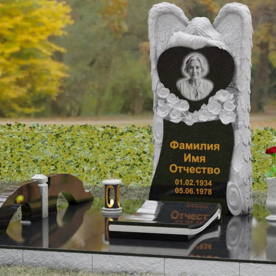 Данная мемориальная композиция представляет собой истинное произведение ритуального искусства, где каждый элемент пропитан глубоким символизмом и благородством. Центральным художественным образом выступает величественная фигура скорбящего ангела, чьи массивные крылья бережно, словно в последней попытке защитить, обрамляют стелу в форме сердца. Мастерство камнереза здесь проявляется в искусной игре контрастов: матовая, детально проработанная фактура оперения крыльев и драпировок одежды небесного покровителя противопоставлена зеркально отполированной глади черного гранита. Именно на этой поверхности, лишенной малейших изъянов, свет преломляется наиболее эффектно, создавая ощущение глубины и монументальности.