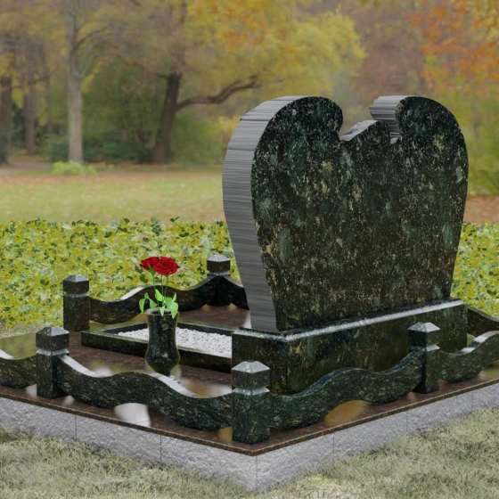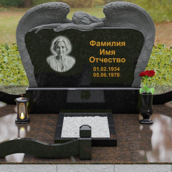 Представленный мемориальный комплекс (Артикул 130) является подлинным шедевром современной ритуальной архитектуры. Это не просто знак памяти, а монументальное художественное произведение, в котором гармонично сплелись суровая прочность природного камня и хрупкая нежность скульптурной пластики. Центральное место в композиции занимает величественная стела, выполненная в уникальном комбинированном стиле. Глубокий, антрацитово-черный массив основной плиты с безупречной зеркальной полировкой служит идеальным холстом для мемориальной гравировки. Его обрамляет искусно вырезанная из светлого камня фигура скорбящего ангела. Мастер добился поразительной детализации: вы можете видеть каждое перышко на мощных, распростертых крыльях, которые словно защищают покой ушедшего человека. Контраст между матовой, фактурной поверхностью резных элементов и глянцевым блеском основного камня создает невероятную визуальную глубину.