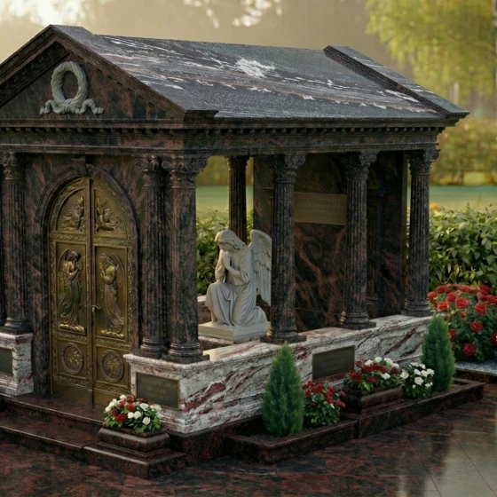 Представляем вашему вниманию величественную стелу – монументальный мемориальный комплекс ПН 043, который является не просто памятником, а настоящим произведением искусства, воплощающим глубокое уважение и вечную память. Этот архитектурный шедевр выполнен в форме изящного мавзолея с открытой крышей, создающей ощущение возвышенности и стремления к небесам. Строгие, но при этом гармоничные линии классической архитектуры, с колоннами и фронтоном, придают комплексу неподвластную времени элегантность. Центральное место занимает величественная стела, выполненная из темного, глубоко полированного камня, который словно зеркало отражает свет, символизируя чистоту и ясность воспоминаний. На этой стеле, расположенной внутри мавзолея, предусмотрено идеальное пространство для гравировки портрета и памятных слов, которые будут увековечены с особой торжественностью. Рядом с ней, в скорбной позе, застыла фигура ангела, вырезанная из светлого мрамора. Ее нежные, плавные линии и объемные складки одеяния создают трогательный контраст с полированной поверхностью стелы, добавляя композиции глубины и эмоциональности. Каждая деталь резьбы, будь то изысканный венок на фронтоне или тонкие узоры на дверях, выполнены с поразительной точностью и мастерством, подчеркивая уникальность и достоинство этого монумента.