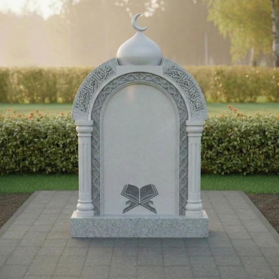 Представляем вашему вниманию величественное надгробие из натурального камня, модель ПН 507, которое является воплощением глубокого уважения и вечной памяти. Этот мемориальный комплекс спроектирован с учетом строгих архитектурных принципов, где каждая линия и форма призваны выразить достоинство и умиротворение. Центральная стела выполнена в форме изящной арки, напоминающей вход в священное пространство, что придает ей особую символичность. Ее внутренняя часть представляет собой глубокий черный полированный портал, создающий эффект зеркальной глади, в которой отражается свет и скорбь. Внешний периметр арки украшен тонкой резьбой, имитирующей витиеватые узоры, характерные для восточной архитектуры, что придает монументу уникальный и узнаваемый облик. Над аркой возвышается куполообразный элемент, увенчанный полумесяцем, что недвусмысленно указывает на его религиозную принадлежность и придает всей композиции завершенность и духовную значимость. Полумесяц выполнен с деликатной точностью, его острые грани четко очерчены на фоне неба, символизируя светлую память.