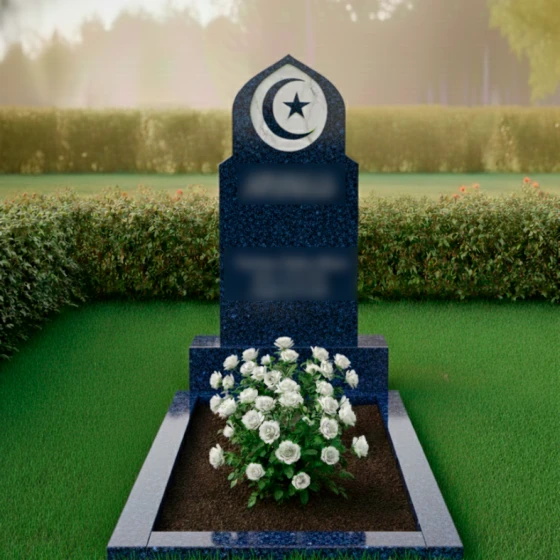Данный мемориальный ансамбль представляет собой истинное воплощение благородства и духовной глубины. Величественная стела, выполненная в форме традиционного восточного купола или стрельчатой арки, сразу приковывает взгляд своей безупречной геометрией. Главным художественным акцентом композиции является искусно интегрированный медальон из белоснежного мрамора, расположенный в верхней части обелиска. В центре этого светлого круга филигранно вырезаны символы веры — полумесяц и пятиконечная звезда. Контраст между глубоким темным цветом основного камня и матовой чистотой мраморной вставки создает эффект небесного свечения, подчеркивая торжественность и значимость момента памяти. Плавные, но при этом строгие линии резьбы по контуру стелы свидетельствуют о высочайшем уровне камнерезного мастерства, превращая холодный камень в одухотворенное изваяние.