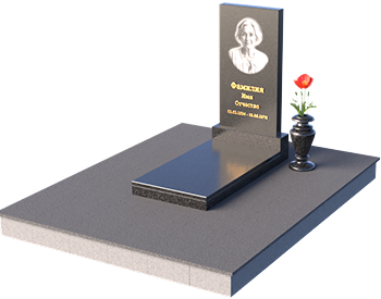 Этот гранитный монумент представляет собой композицию из двух основных элементов: вертикальной плиты с портретом и горизонтальной накладки. Вертикальная плита, возвышающаяся над землей, имеет строгую прямоугольную форму с небольшим скосом в верхней части. Это придает монументу сдержанную элегантность. Зеркальная полировка поверхности отражает свет, создавая ощущение глубины и сияния. На плите выгравирован портрет усопшего, выполненный с высокой точностью и вниманием к деталям. Ниже портрета располагается надпись с именем и датами жизни, выполненная золотым шрифтом. Горизонтальная накладка, расположенная в нижней части, также выполнена из черного полированного гранита и служит своеобразным пьедесталом для вертикальной плиты. Ее гладкая поверхность создает дополнительный контраст с окружающей средой. Рядом с монументом установлена ваза из черного гранита, предназначенная для живых цветов.