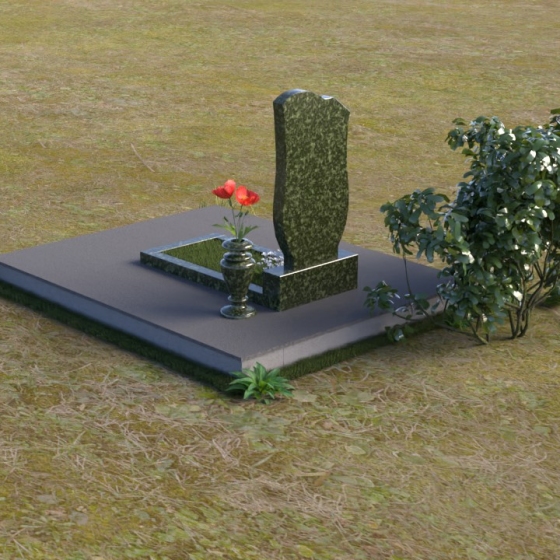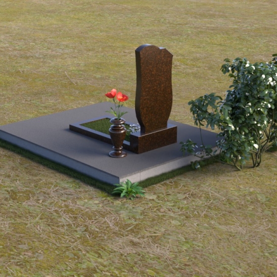 Основу композиции составляет вертикальная стела, выполненная из благородного камня. Её форма – это сочетание строгих линий и мягких, сглаженных углов. Верхняя часть стелы имеет плавный, слегка волнистый контур, который придает ей особую выразительность. Боковые грани стелы деликатно скруглены, что создает ощущение гармонии и завершенности. Фаска, обрамляющая верхнюю часть стелы, подчёркивает её лаконичную форму и добавляет объёмности.