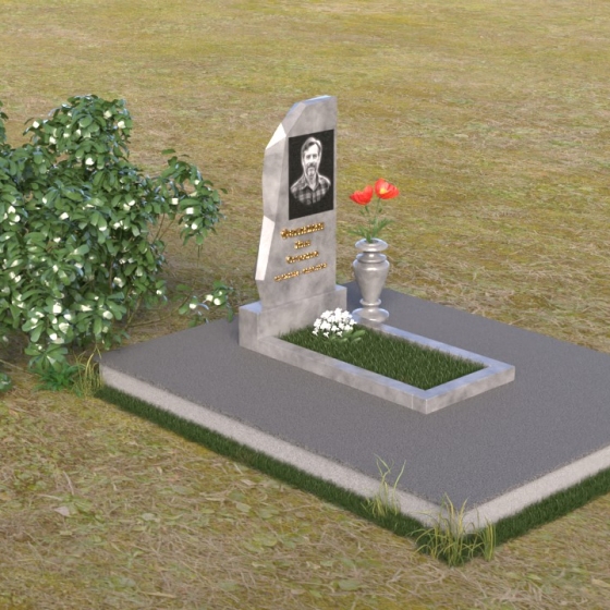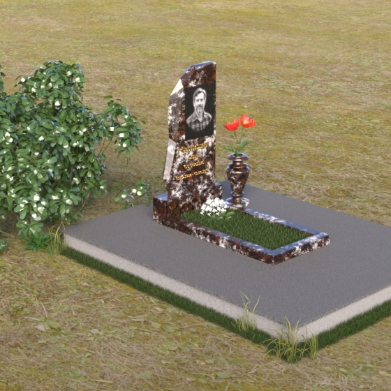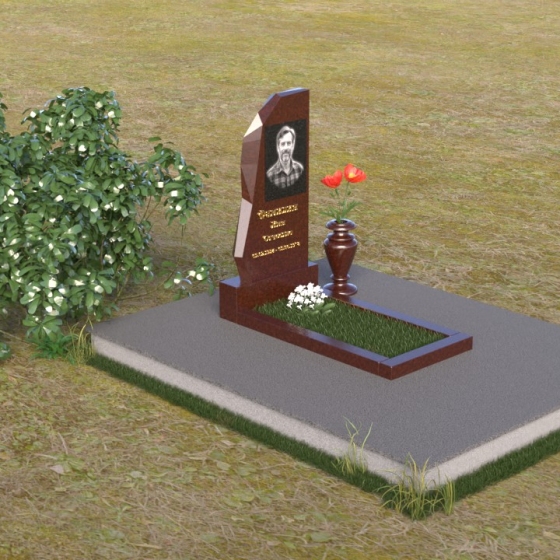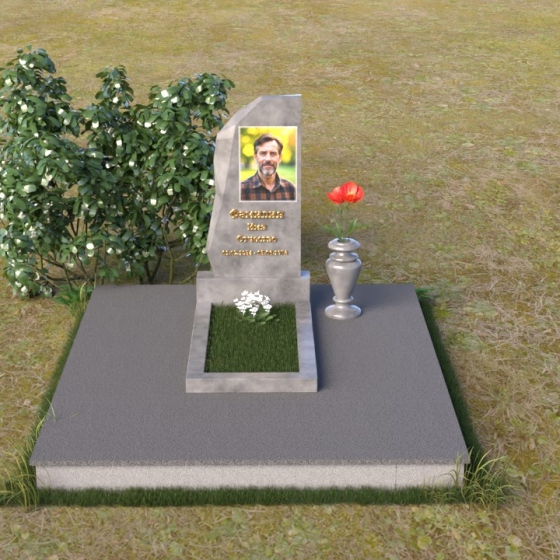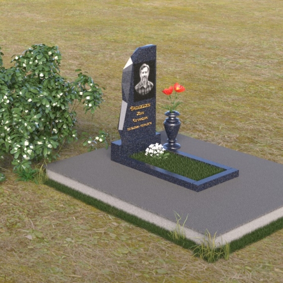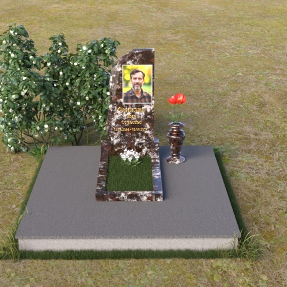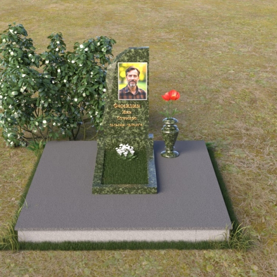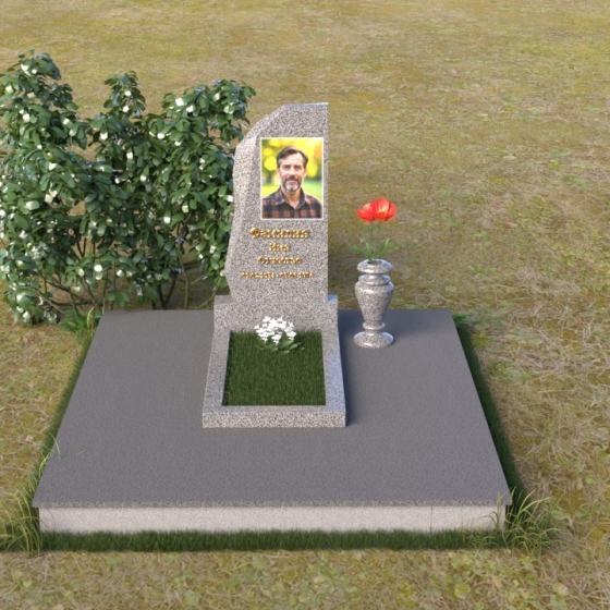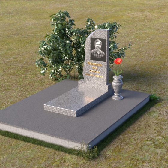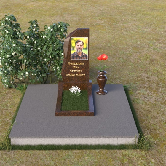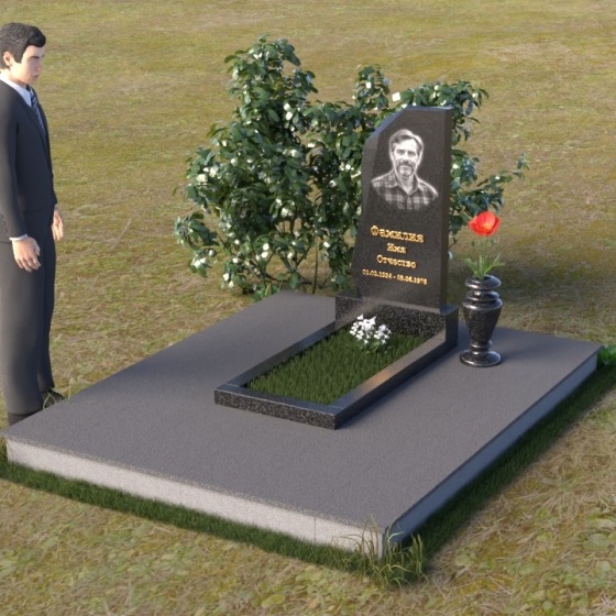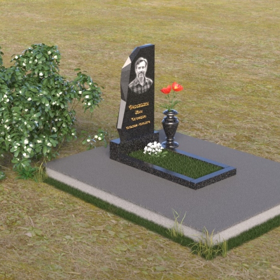 Этот гранитный монумент представляет собой композицию из двух элементов, выполненных в строгом, лаконичном стиле. Основной элемент – вертикально ориентированный обелиск с трапециевидным завершением. Верхняя часть обелиска скошена под углом, что придает ему динамичность и современный вид. Лицевая поверхность обелиска отполирована до зеркального блеска, создавая эффект глубины и отражения. На полированной поверхности выгравированы имя, отчество и даты жизни усопшего, а также его портрет. Нижняя часть монумента представляет собой прямоугольную тумбу, которая служит основанием для обелиска. Тумба также выполнена из гранита и имеет полированную поверхность. Сбоку от монумента располагается небольшая ваза из черного гранита, предназначенная для цветов. Все элементы памятника гармонично сочетаются друг с другом, создавая целостный и завершенный образ.