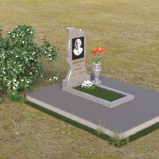 Ниже стелы располагается горизонтальная плита, выполненная из того же материала, что и стела. Она служит основанием для цветника и вазы. Поверхность плиты отполирована до зеркального блеска, создавая эффект глубины и отражения, словно напоминая о чистоте души ушедшего. Небольшая ваза из черного гранита завершает композицию, придавая ей завершенный вид.