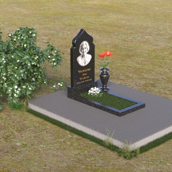 Величественная стела ПВ 059 представляет собой лаконичную, но выразительную композицию. Основной элемент – вертикальная плита из черного гранита, с зеркальной полировкой. Верхняя часть стелы имеет сложную форму, напоминающую мягкий, скругленный свод, с небольшим углублением в центре, что придает ей визуальную легкость и устремленность ввысь. Боковые грани стелы плавно скруглены, лишены острых углов, что создает ощущение мягкости и спокойствия. На лицевой стороне стелы размещен портрет усопшего, выполненный с высокой детализацией. Ниже портрета выгравированы имя и даты жизни, выполненные элегантным шрифтом.