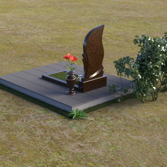 Начиная с основания, мы видим строгую геометрическую подставку, выполненную из того же материала, что и стела. Ее прямые углы и четкие линии создают ощущение стабильности и надежности. Далее взгляд переходит к полированной горизонтальной плите, на которой можно разместить цветы или другие памятные предметы. Сама стела, возвышаясь над плитой, представляет собой изящную дугу, словно застывшую в вечном поклоне. Ее левый край плавно переходит в тонкую линию, а правый – более массивный, украшенный деликатной резкой, имитирующей драпировку, придающую композиции легкость и воздушность. Эта асимметрия создает ощущение динамики и жизни, словно камень дышит и движется. На боковой грани стелы можно увидеть изящную вазу, предназначенную для живых цветов, которые станут символом неувядающей памяти.